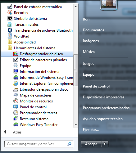 Inicio>Todos los programas>Accesorios>Clic en herramientas del sistemas>Y finalmente clic en desfragmentador de disco