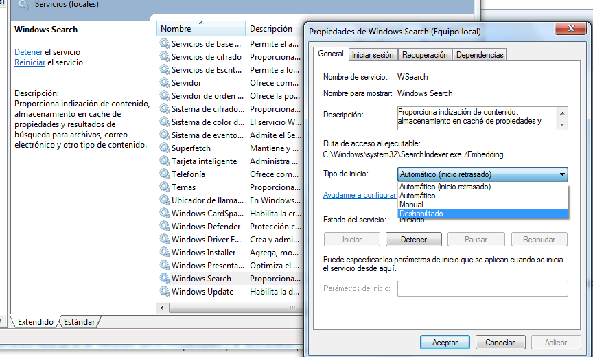 Inicio>Buscas servicios>Buscas el de Windows serch>Propiedades y le deshabilitas.